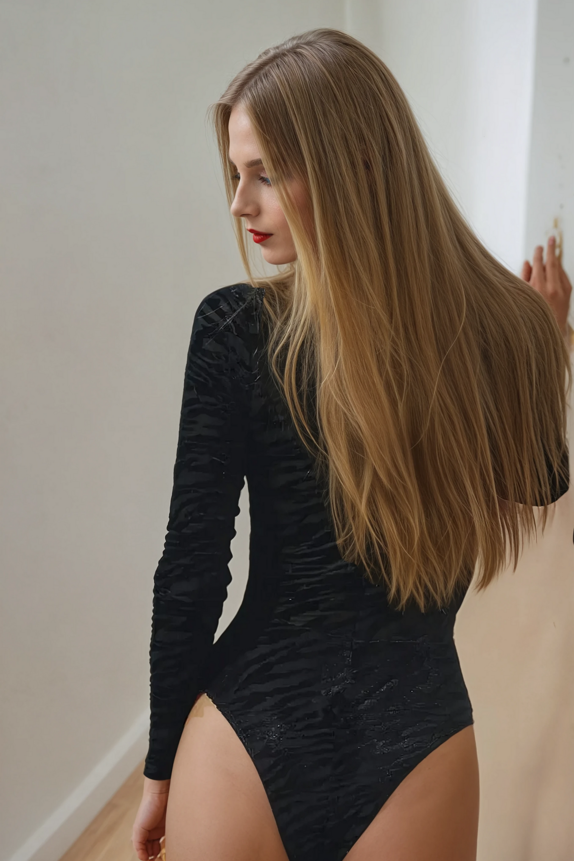 Fierce, refined, and unapologetically bold—the Shadow Kiss Bodysuit is a statement in texture and silhouette. Crafted from semi-sheer mesh with a velvet flocked zebra pattern, this long-sleeve piece combines subtle sparkle with dramatic contrast. The high-cut leg and second-skin fit contour the body, while the crew neckline keeps the look sleek and modern. Designed for nights out, layering under blazers, or stealing the spotlight on its own.