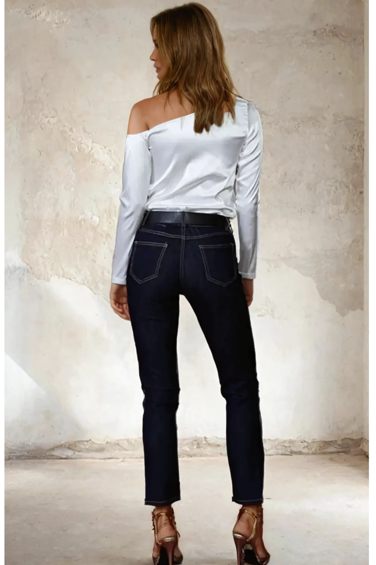 Designed to elevate everyday denim, the Daria Zip Hem Jeans sculpt your silhouette with a sleek high-waisted fit and tapered leg. Featuring statement front seams, silver-tone zip slits at the hem, and contrast topstitching throughout, these jeans bring a modern edge to classic dark-wash denim. A wardrobe essential for styling up or down.