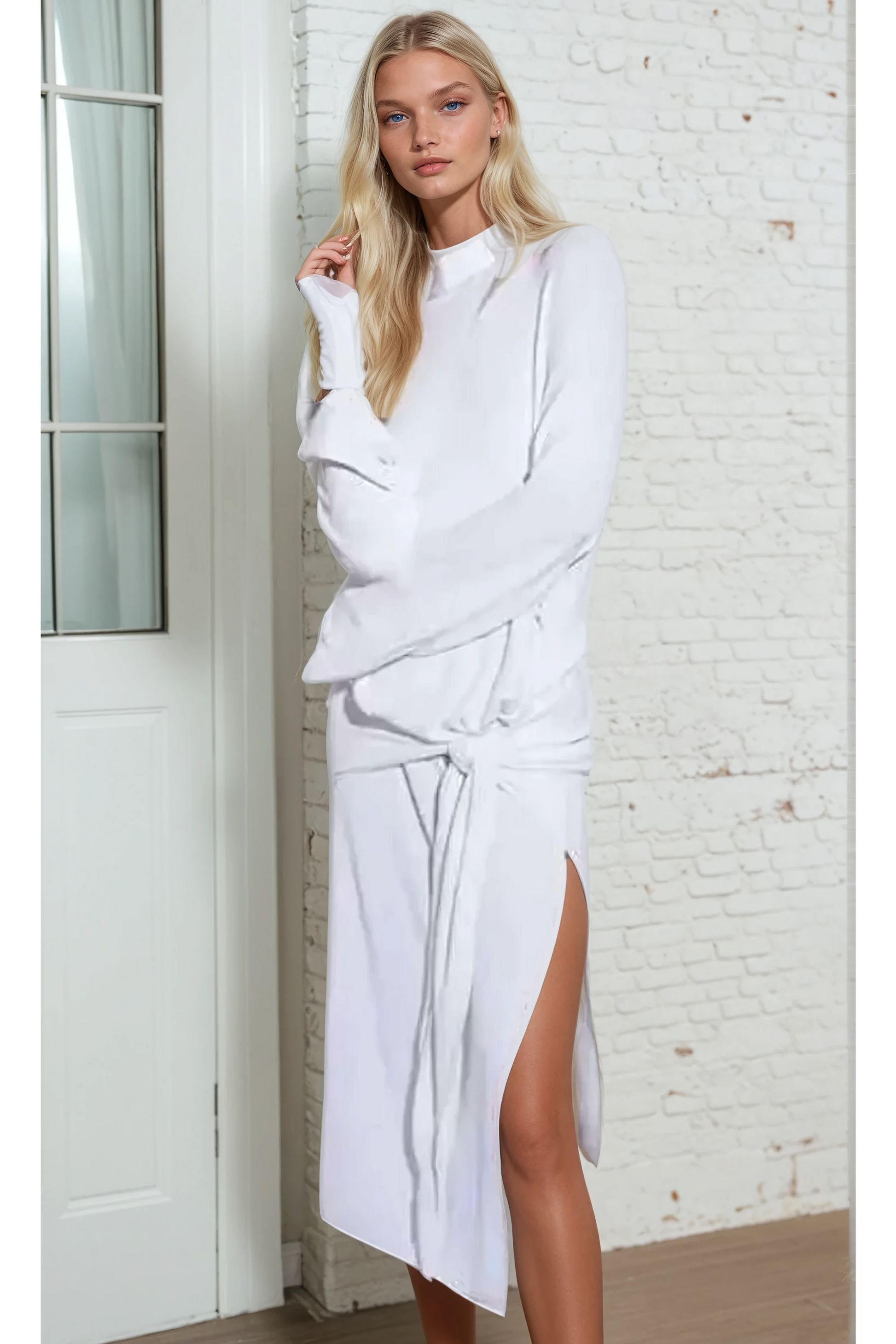 Elevate your cold-weather wardrobe with the Winter Tie Knit Dress — where comfort meets sleek sophistication. Crafted from a thick, warm knit, this piece offers a sculpted silhouette with relaxed elegance. The front tie detail allows for flattering waist definition, while the high neckline and thigh-high split add a modern, confident edge.