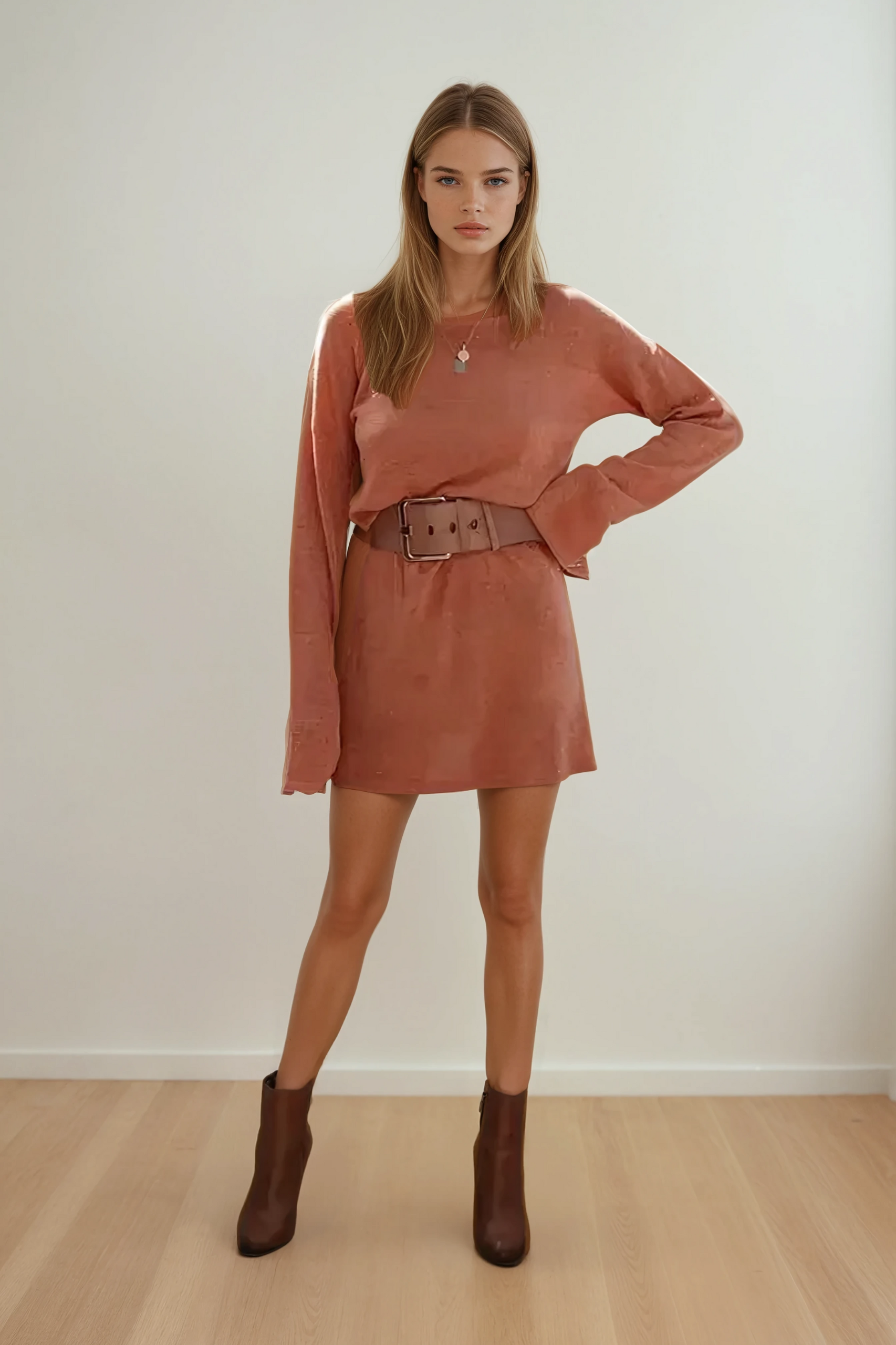 The Rachael Knit Dress is all about effortless elegance with a hint of allure. Crafted from a soft textured knit, it features a lightweight, semi-sheer finish that drapes beautifully on the body. Perfect for layering or wearing solo, this long-sleeve mini silhouette is your go-to for transitional dressing. Belt not included—style it your way.