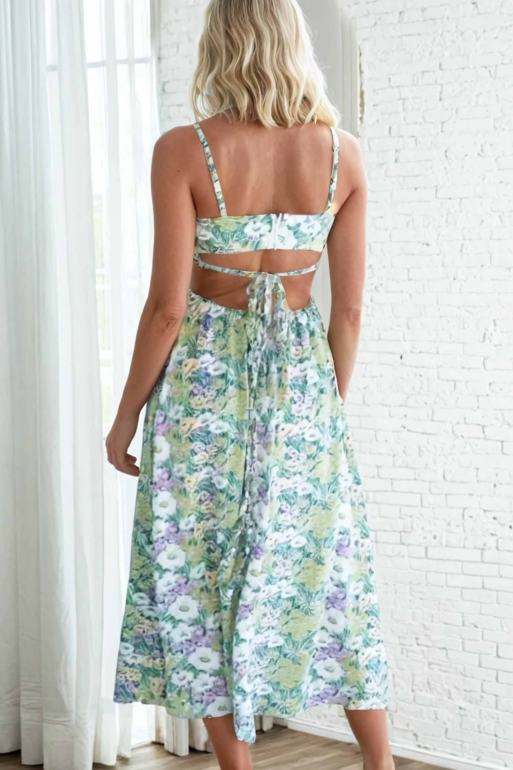 Step into a scene of painted blooms with the Garden Reverie Midi Dress. This dreamy floral midi features a soft watercolor-style print in pastel greens, lavenders, and whites. A bandeau-style bodice and thin adjustable straps meet a cinched waist, while side cut-outs and an open back with tie detail add just the right touch of flirtation. Lightweight and romantic, it's the ultimate spring-to-summer statement.