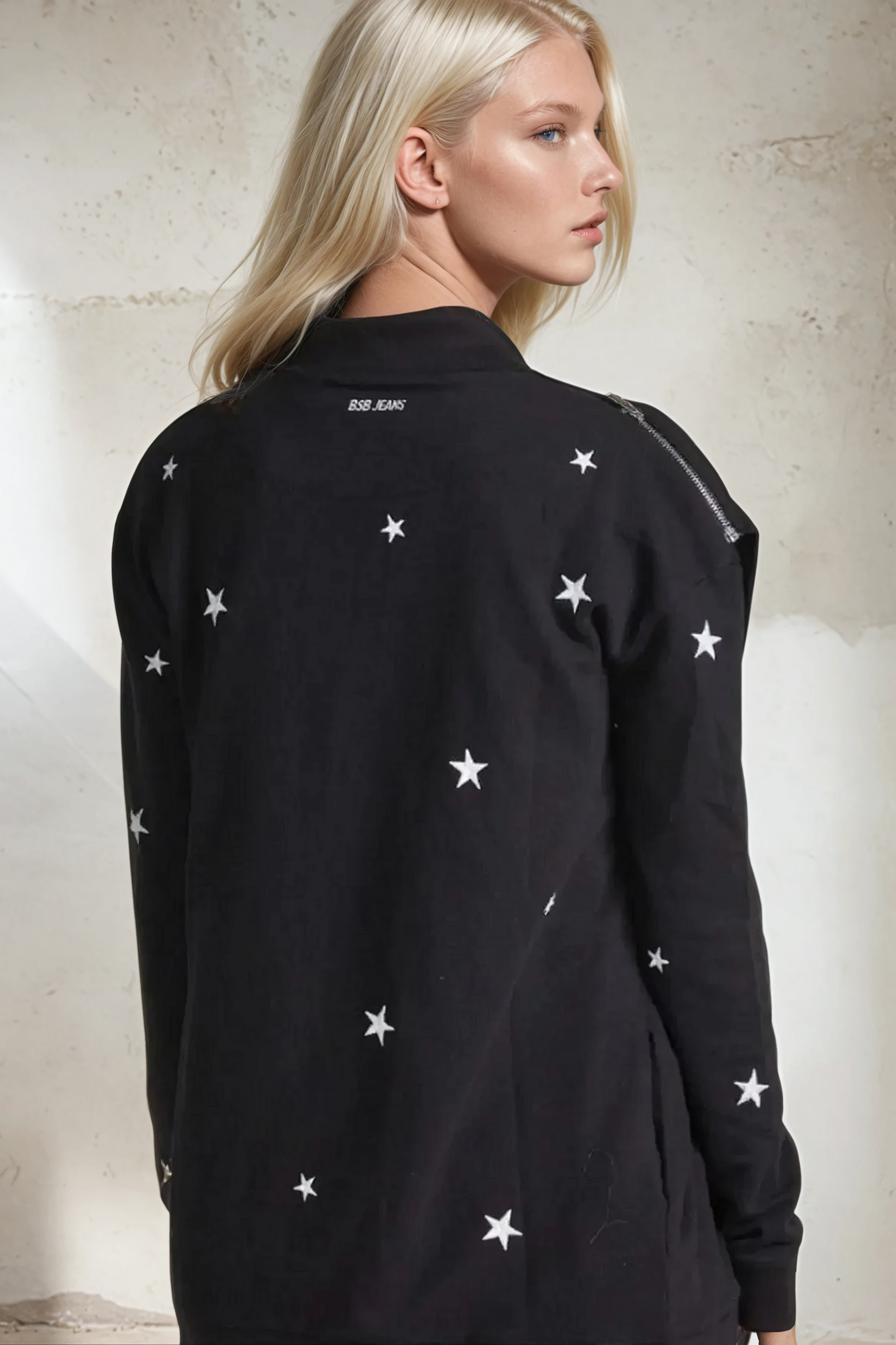 Wrap yourself in celestial comfort with the Falling Star Cardigan. This relaxed-fit black cardigan is scattered with embroidered white stars, bringing a playful yet dreamy mood to your casual edits. Featuring a draped neckline, an asymmetric wrap front, and ribbed cuffs, it combines a cozy feel with elevated detail. The metal zip along the shoulder and subtle back branding by BSB Jeans add a street-chic edge, while the soft fabrication makes it perfect for layering all year round.