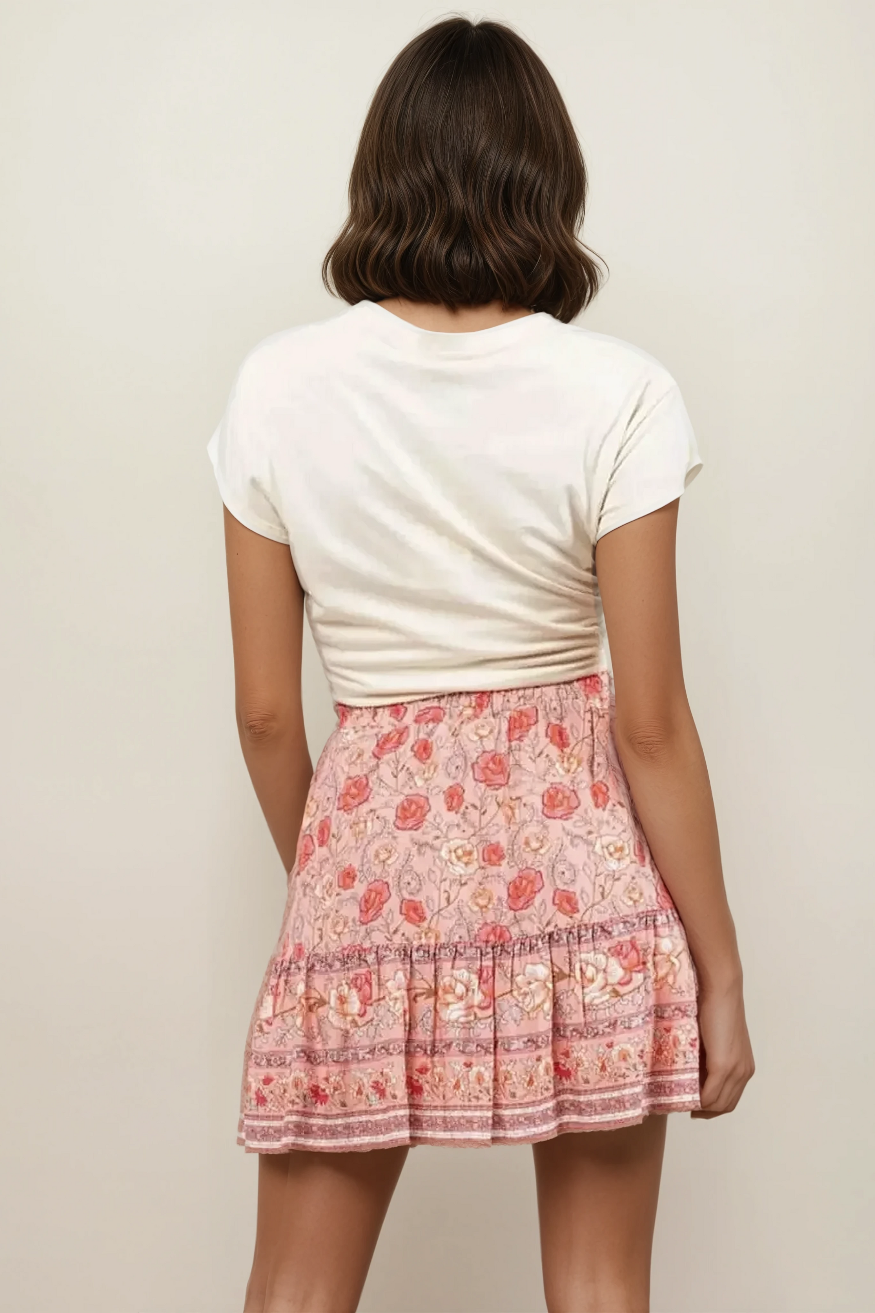 Breeze into effortless femininity with the Rosabelle Boho Skirt, a romantic mini skirt designed with vintage florals and soft, flowy movement. The elasticated waistband with an adjustable drawstring ensures comfort and versatility, while delicate tiered panels and lace trim add a whimsical touch. Decorated in a rose-pink palette with an intricate floral border print, this skirt is perfect for sun-filled weekends, beach strolls, or boho-inspired day dates. Style with a tied tee or crochet top for an easy, free-spirited look.