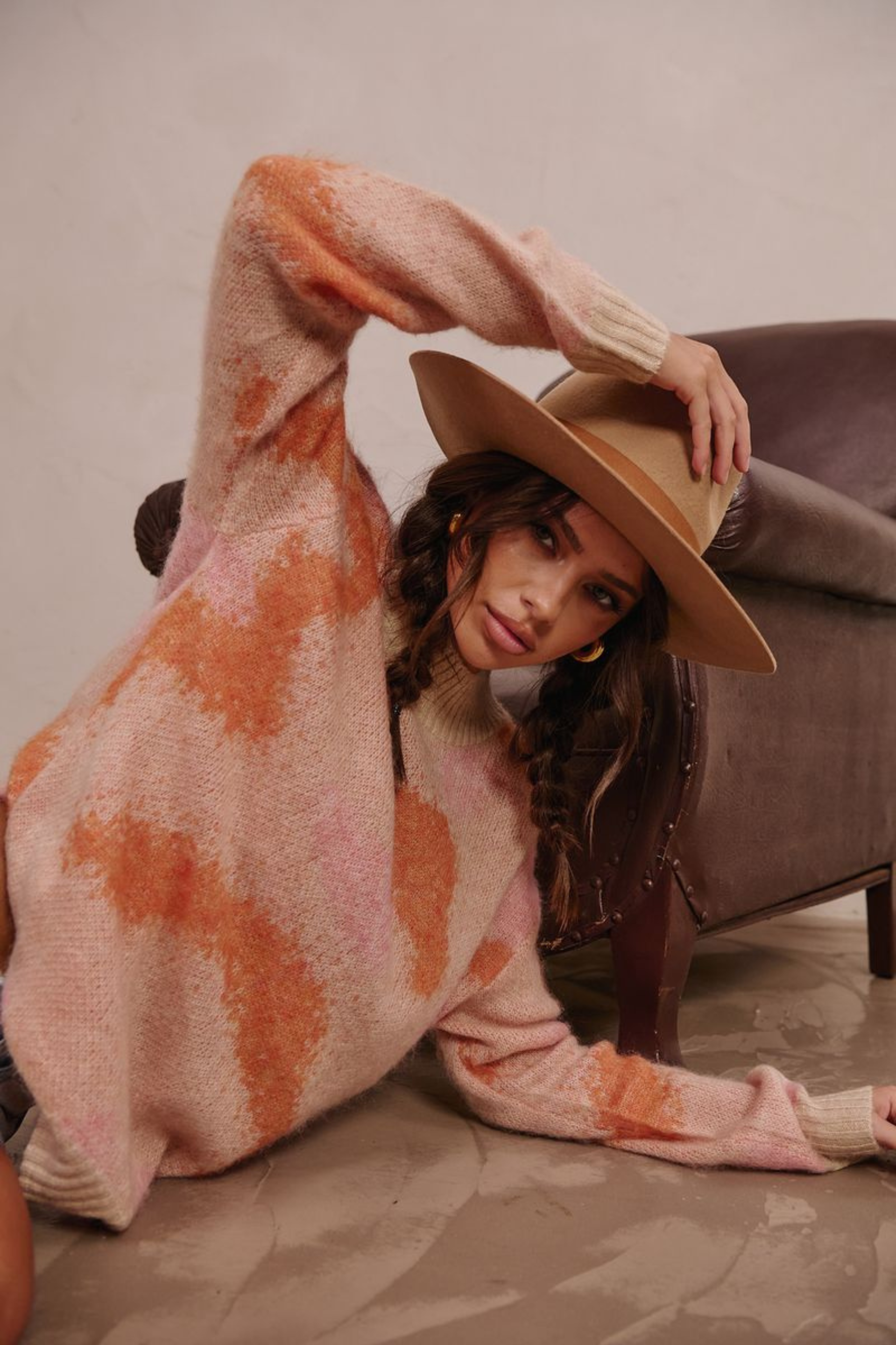 Wrap yourself in the rustic charm of the Sundown Woolie Sweater, where cozy meets cowgirl. With its painterly blend of blush, peach, and coral tones, this soft knit evokes the warmth of golden hour skies. Designed with a relaxed silhouette and dropped shoulders, it's made from a brushed wool-blend fabric that delivers both comfort and character. Perfect for fireside lounging or styled with denim cutoffs and boots for a Western-inspired edge.