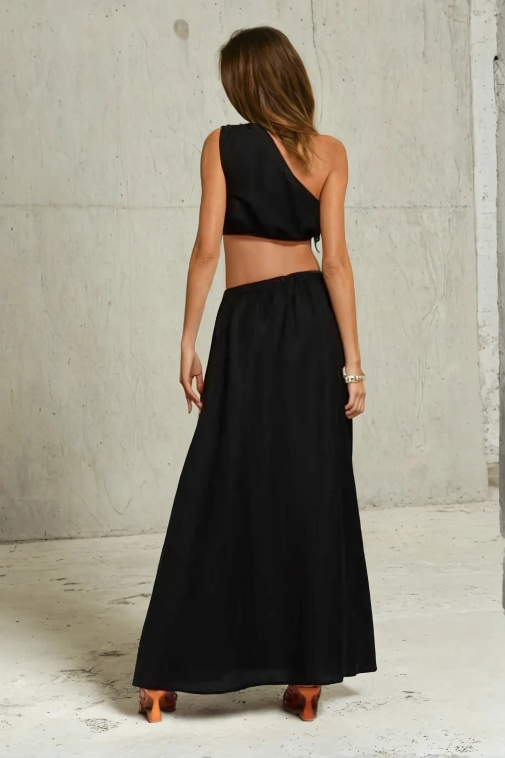 Elevate your off-duty look with the Alexandria Two-Piece Set—a breezy blend of effortless style and modern allure. Crafted from a linen-based fabric, this ensemble features a one-shoulder crop top with an adjustable drawstring detail and a coordinating flowy maxi skirt that sits comfortably at the waist. Perfect for seaside escapes or sunset dinners, it balances comfort with sophistication in a timeless black hue.