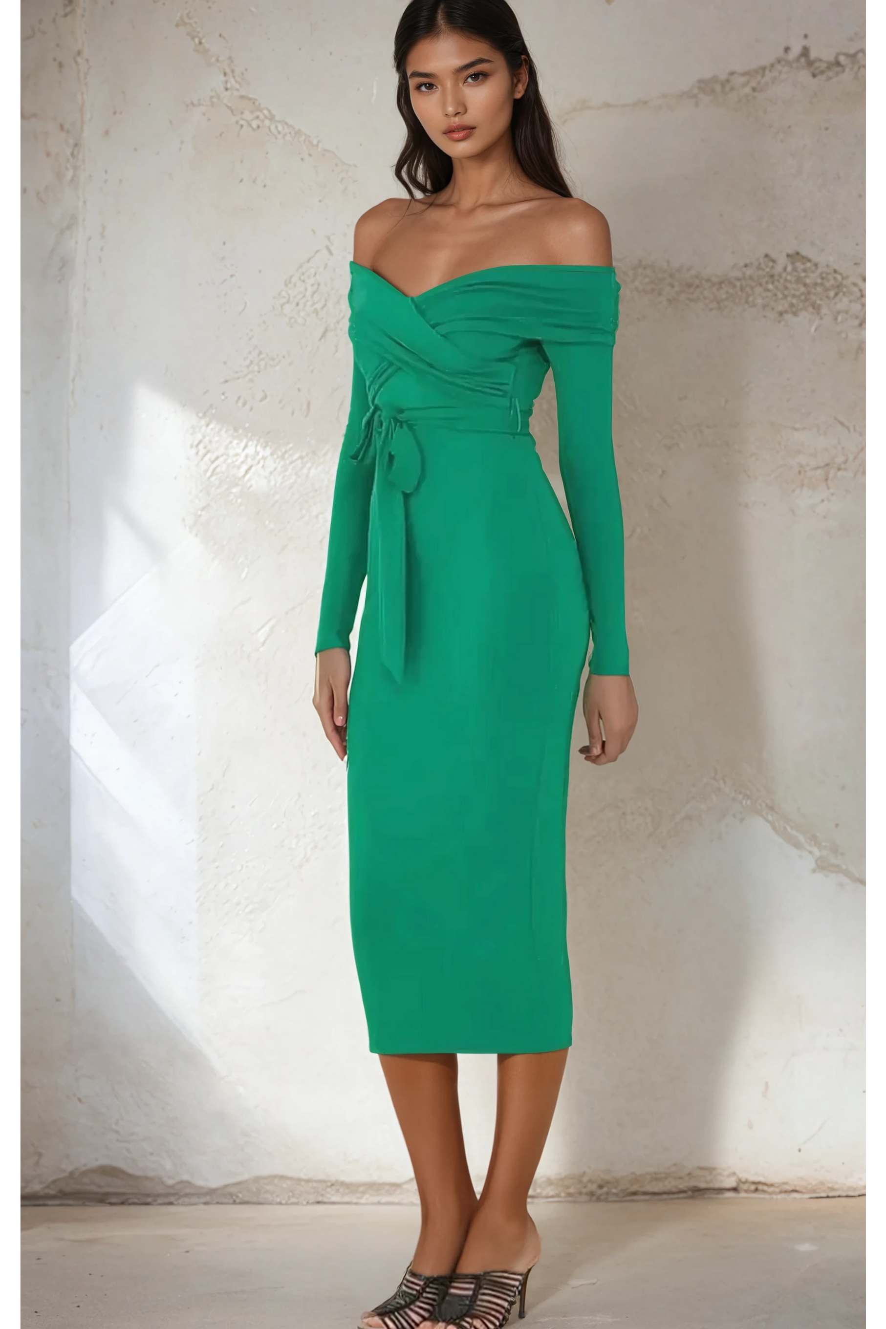 Graceful and bold, the Amalia Midi Dress is designed to make a statement with elegance. Featuring an off-the-shoulder neckline and body-hugging silhouette, this vibrant green stunner flatters every curve while exuding confidence. The wrap-style bodice and self-tie waist detail add structure and femininity, making it perfect for formal events, cocktail nights, or weddings. Amalia is the definition of timeless sophistication—with a modern twist.