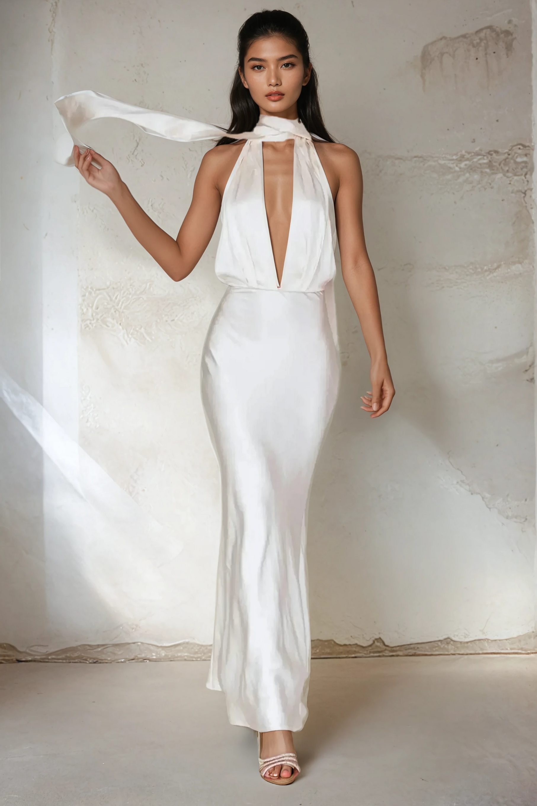 Designed to captivate in motion and stillness, the De Jour Halterneck Maxi Dress is a statement in timeless elegance. Crafted from fluid satin with a lustrous finish, this backless silhouette features a plunging halterneck, scarf-tie detail, and a figure-skimming fit that flatters from every angle. With a sleek low back and floor-sweeping hem, it's perfect for evening events, destination weddings, or any occasion that calls for effortless glamour.