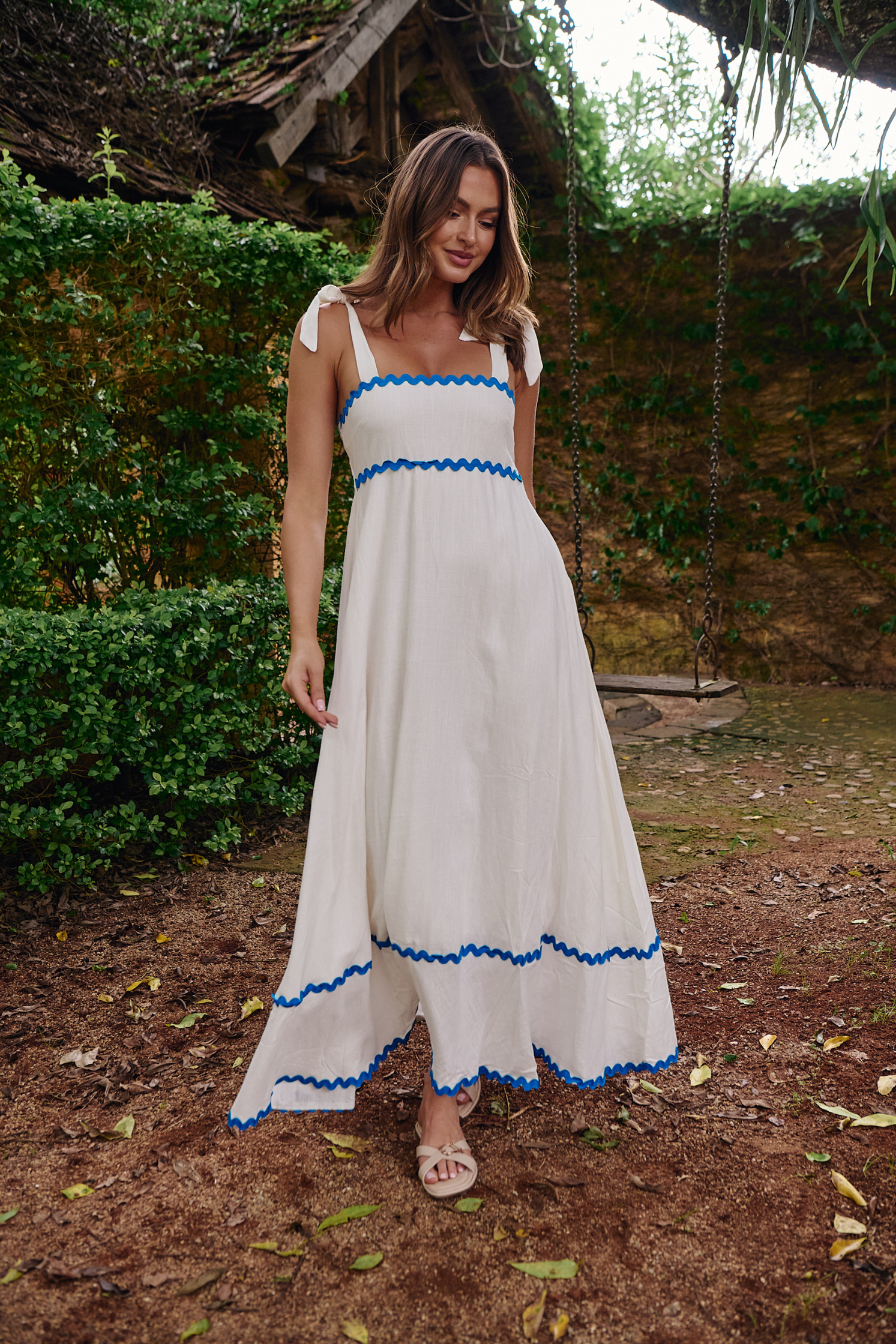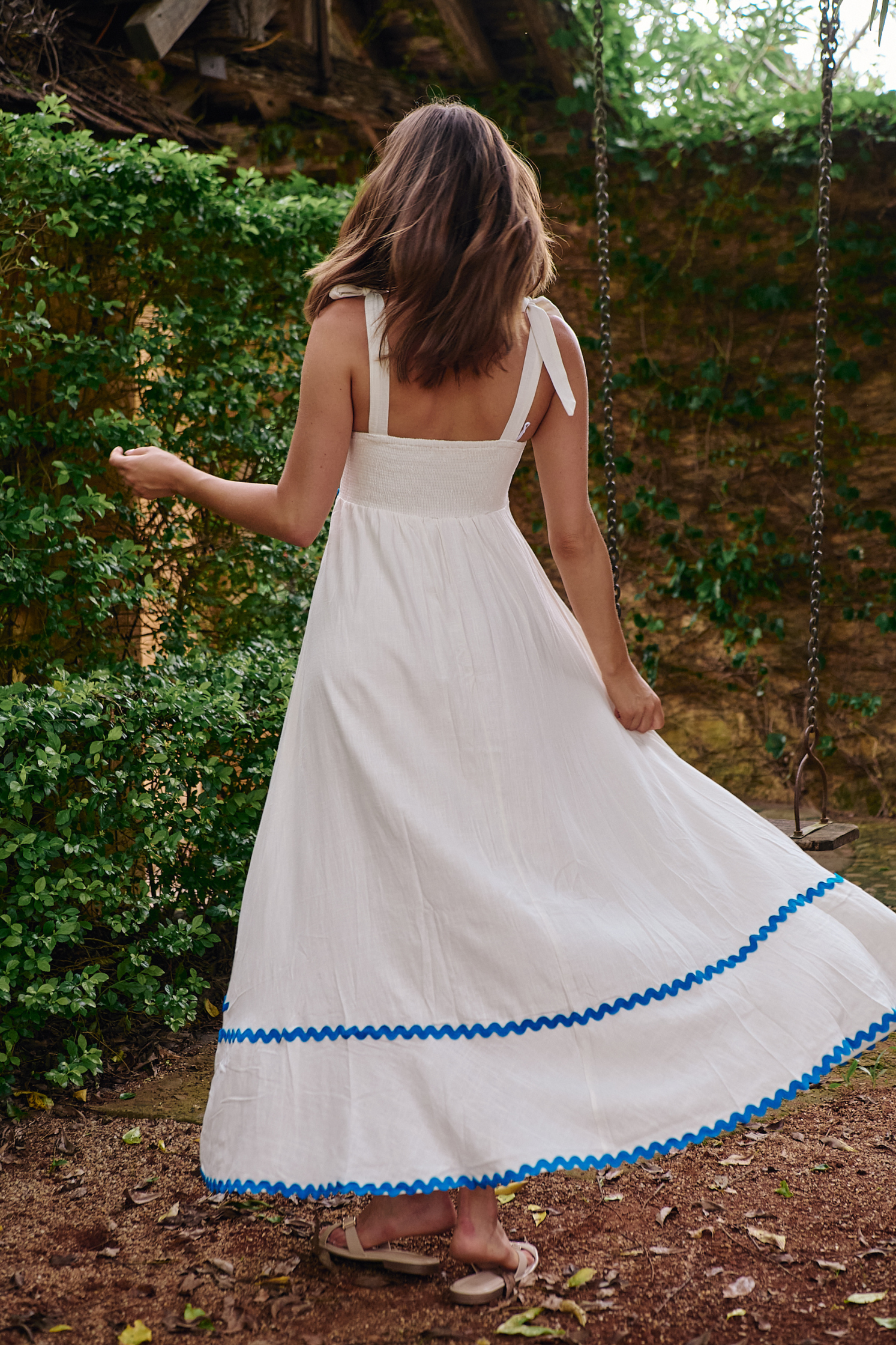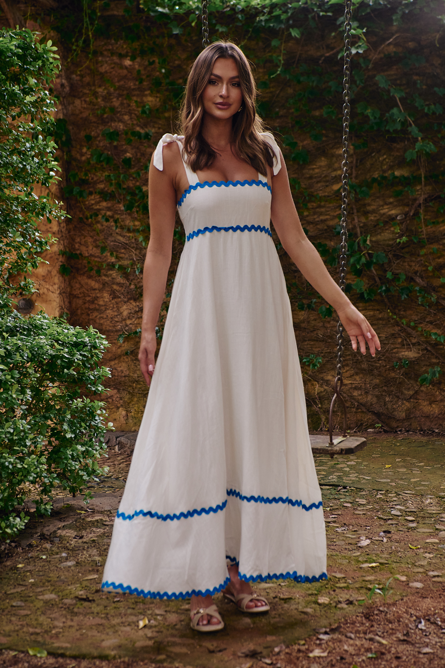 Breezy, beautiful, and made for sun-soaked days — the Hydra Maxi Dress captures effortless coastal style. Crafted from breathable linen and fully lined for comfort, it features charming shoulder ties, a flattering shirred back, and bold blue wave trims that trace the hem and bodice. This dress flows with every step and is the perfect pick for garden parties, beach escapes, or European summer vibes.