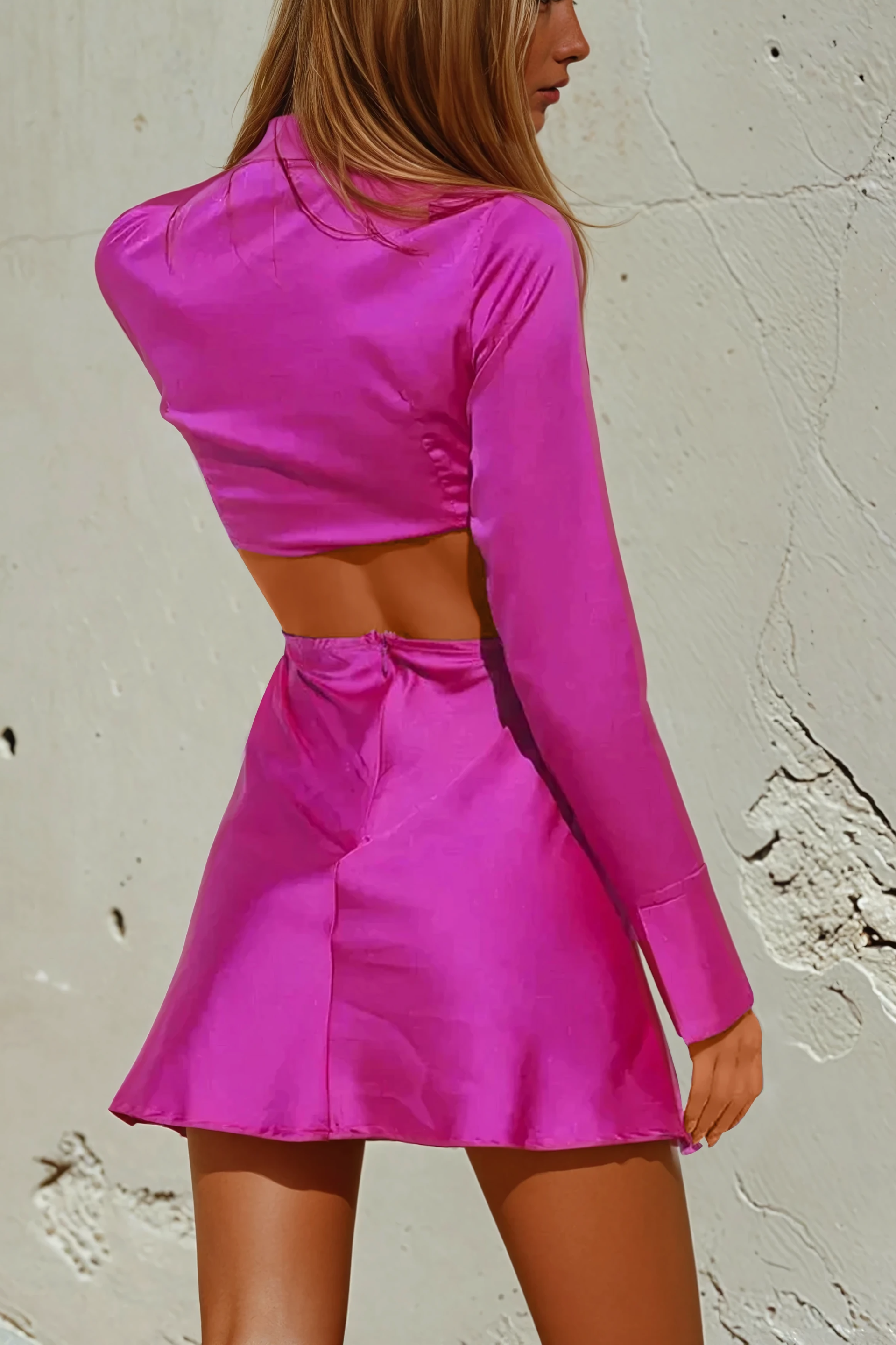 The Kayla Mini Dress is the perfect balance of elegance and modern style. Featuring a flattering midi length and wide, long sleeves, this dress exudes a relaxed yet sophisticated vibe. The adjustable ties at the waist allow you to customize the fit, while the cut-out detailing under the bust and extending to the back adds a bold and chic touch. With a back zipper for easy wear, this dress is designed with a sleek, tailored look and offers a breathable feel with its 100% Polyester composition. Whether you're attending an event or enjoying a night out, the Kayla MiniDress offers both style and comfort.