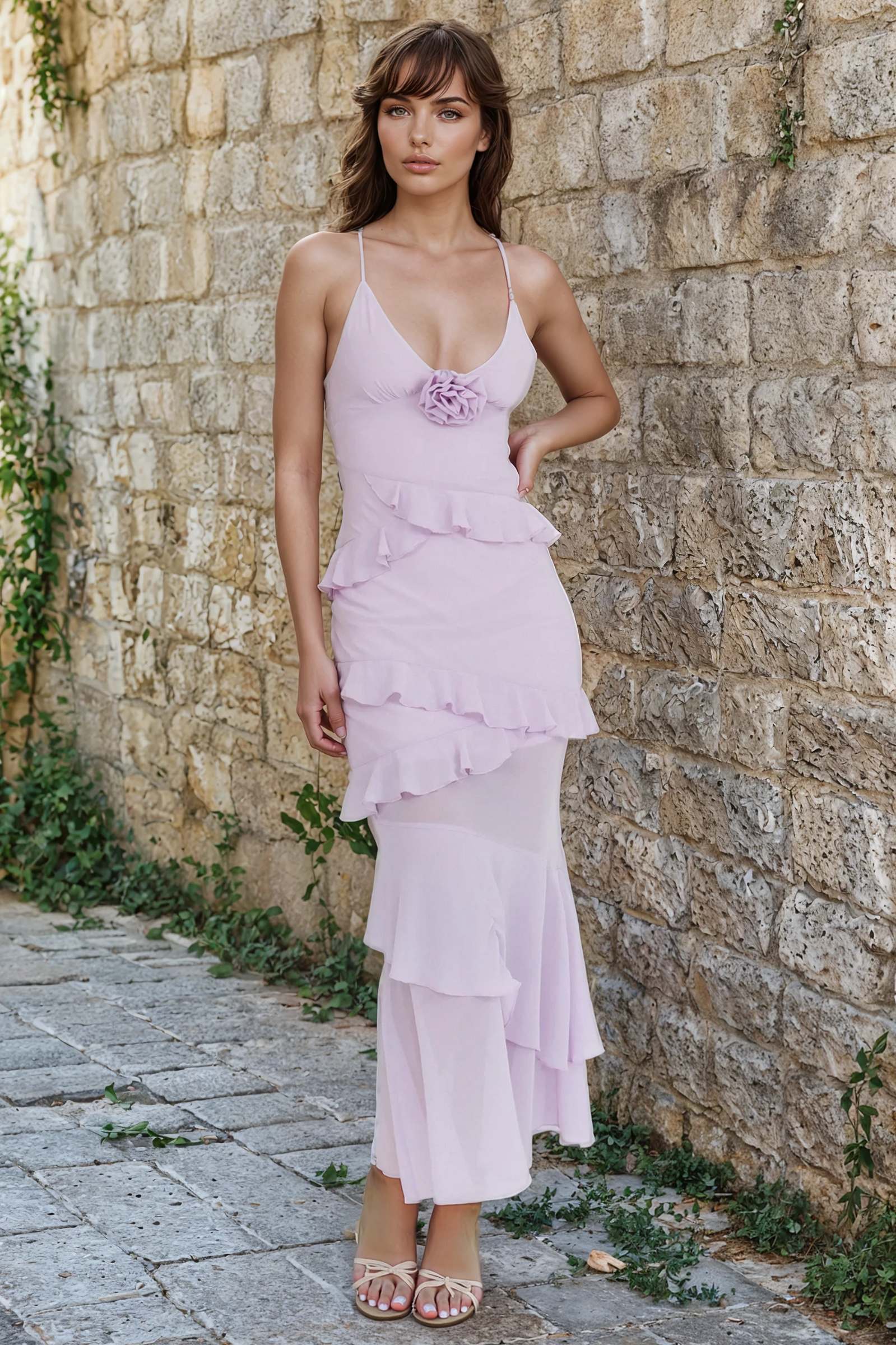 Feminine, floaty, and made to move — the Noelle Ruffle Maxi Dress captures effortless romance with every step. Crafted in a dreamy lilac hue, this dress features cascading ruffles, a soft V-neckline, and a delicate rosette detail at the bust. The fitted bodice flows into a sheer panelled skirt with soft movement, perfect for garden soirées, romantic dinners, or daytime occasions with a touch of elegance.