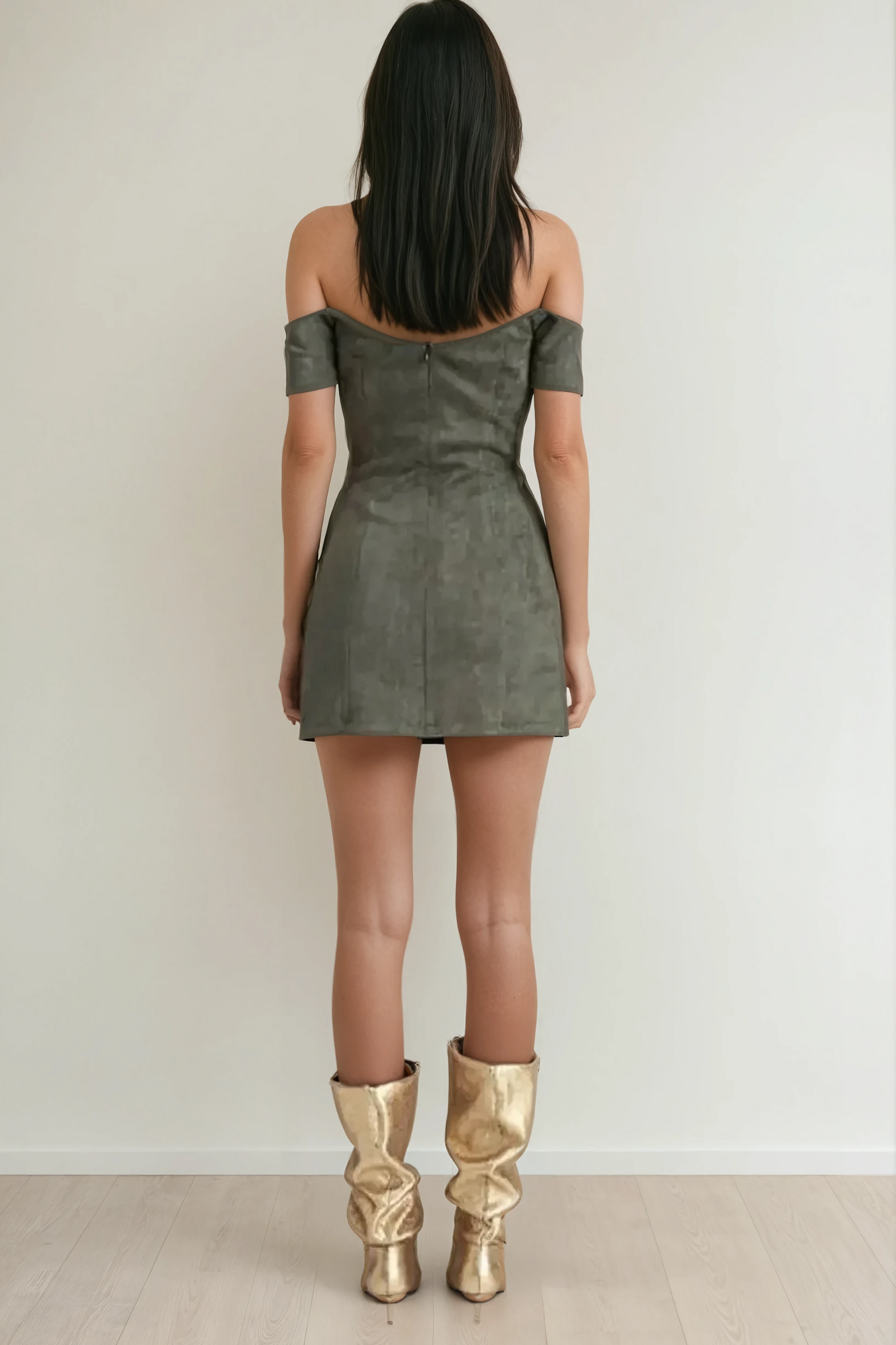 Meet the Olive Crush Mini Dress — a sculpted off-shoulder silhouette that’s both structured and sultry. Crafted from a suede-style fabric with a soft-touch matte finish, this form-fitting mini dress makes an impression from every angle. The sweetheart-inspired neckline and folded bust detail elevate the elegance, while the short sleeves rest effortlessly off the shoulder. A sleek hidden zipper at the back ensures a clean finish, perfect for styling with bold accessories or worn solo as a statement piece.