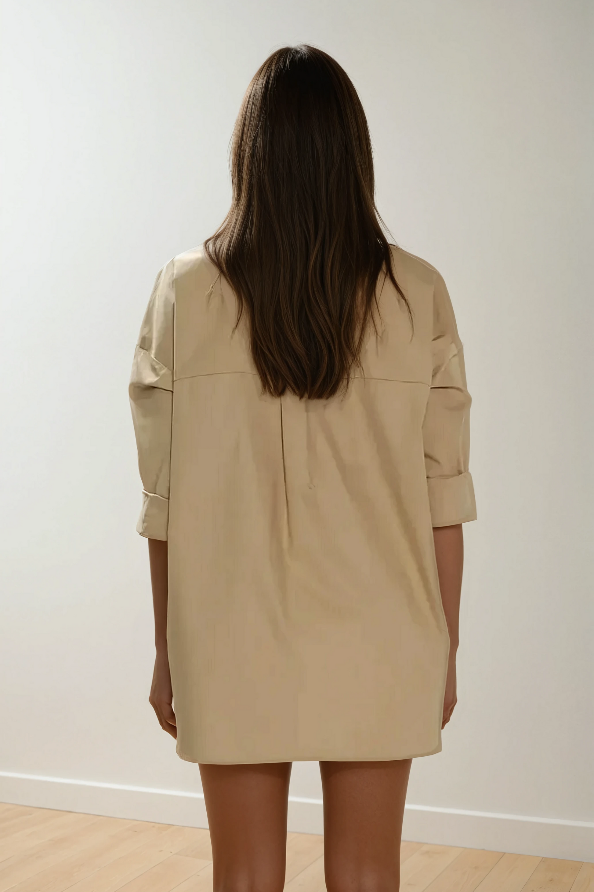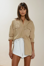 Effortlessly blending utility with understated chic, the Sahara Pocket Shirt is your go-to for relaxed sophistication. Crafted in a soft sand-toned fabric with a subtle sheen, this oversized button-up shirt features statement front flap pockets, a classic collar, and a fluid drape that flatters every silhouette. Perfect for layering or wearing solo, it's designed for versatile styling—whether tucked into tailored pants or worn loose over shorts for a laid-back look.