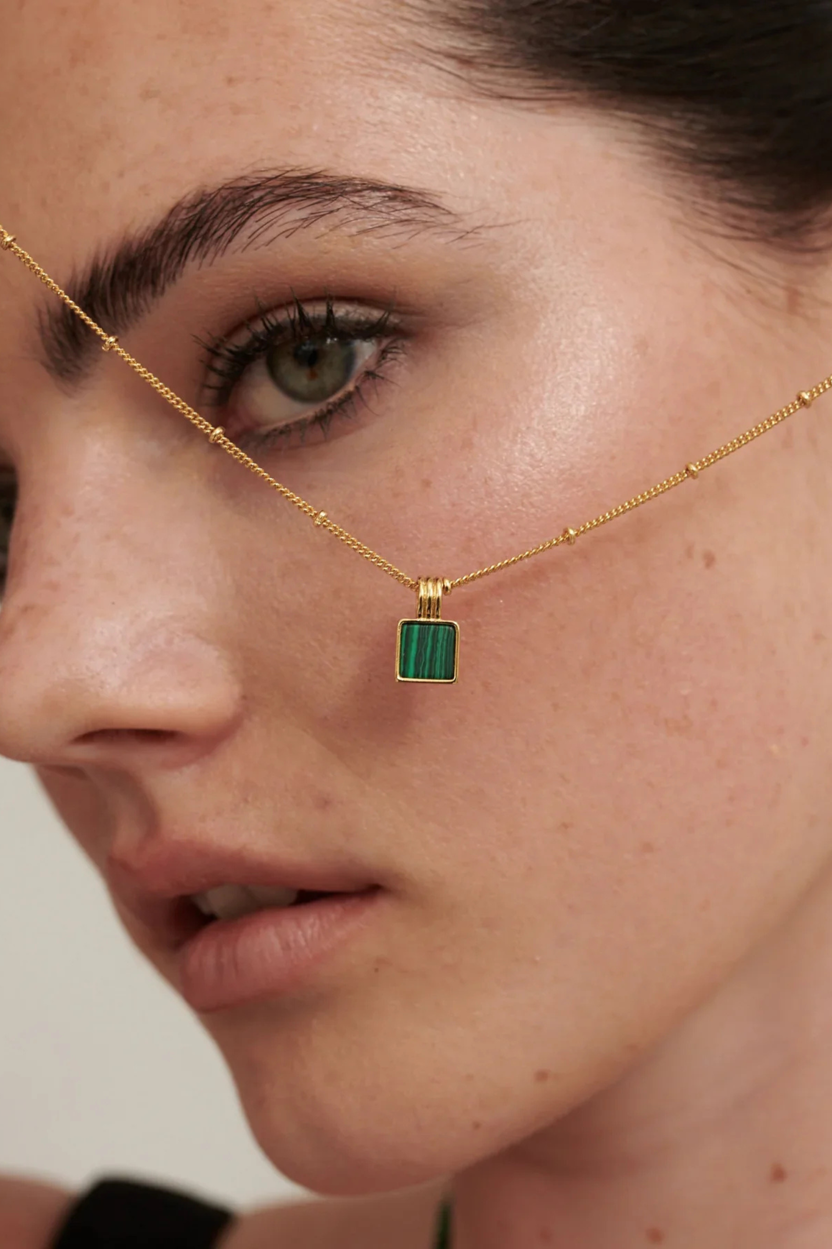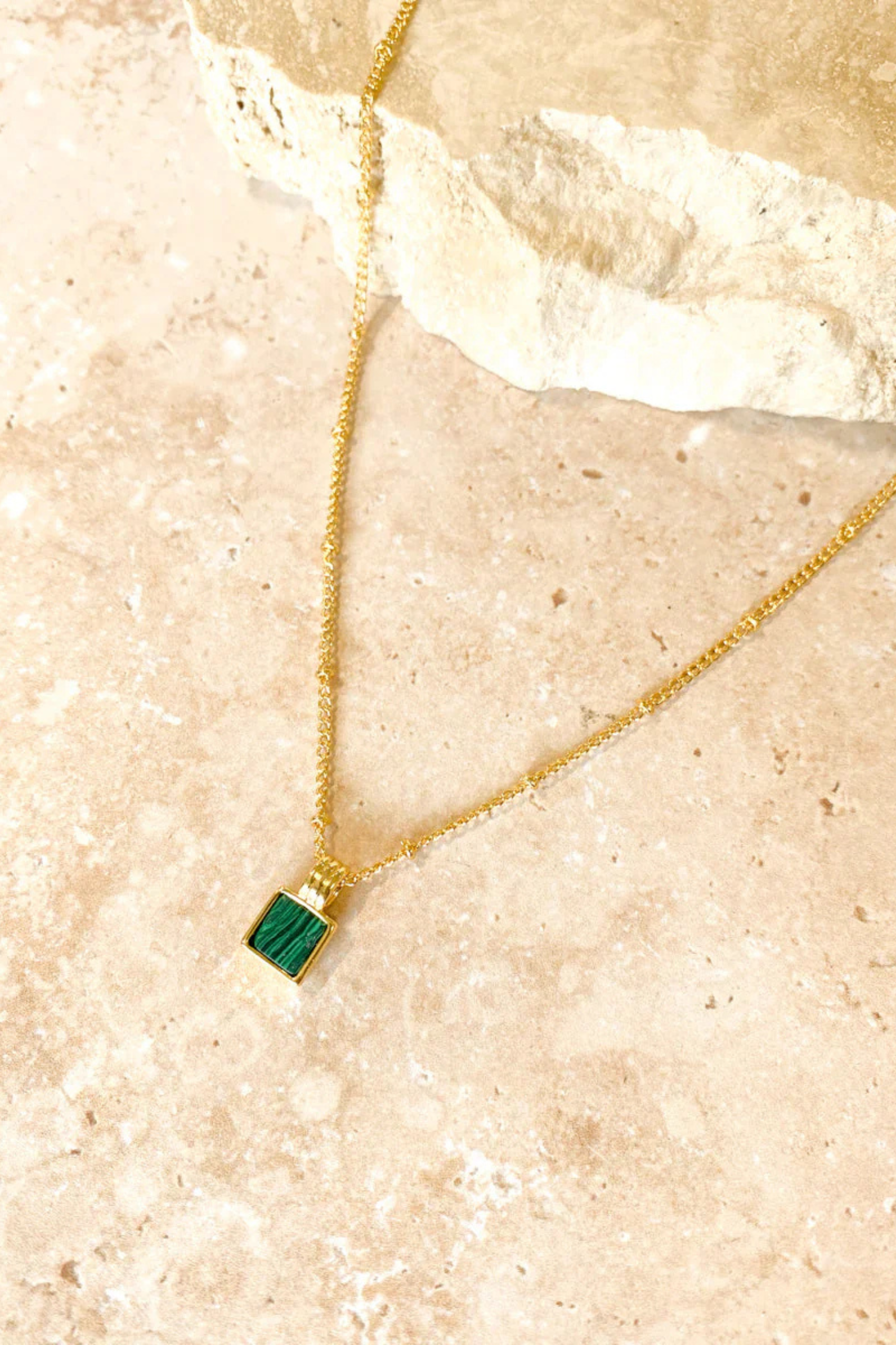 Elevate your everyday with the Seraphina Malachite Pendant Necklace—a fine balance of modern minimalism and timeless elegance. This delicate piece features a square-cut malachite stone framed in 18K gold-plated brass, suspended from a dainty beaded chain. The rich green tones of the natural malachite make each necklace uniquely yours, while the gold finish brings a touch of luxe to daily wear. Beautiful on its own or layered with other chains, Seraphina is designed for quiet statement-making.