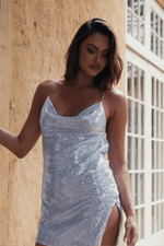 Shimmer, seduce, and steal the show in the Spotlight Sequin Mini Dress. Designed with high-glam energy, this dazzling black mini features all-over sequin sparkle, a dramatic thigh-high split, and unlined sides that reveal just the right amount. The open back is elevated by diamante cross-back straps, making this a true scene-stealer for your next night out.