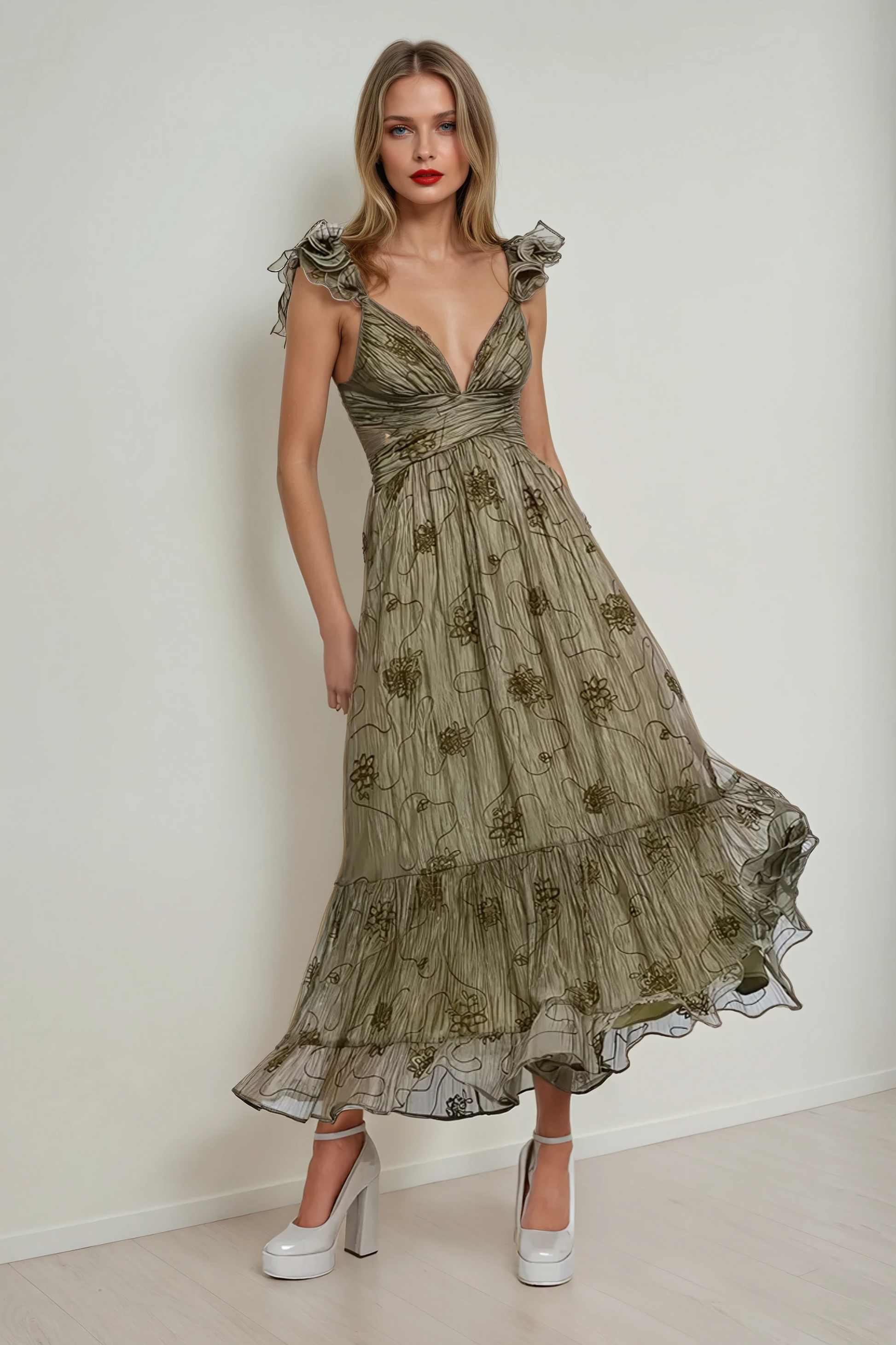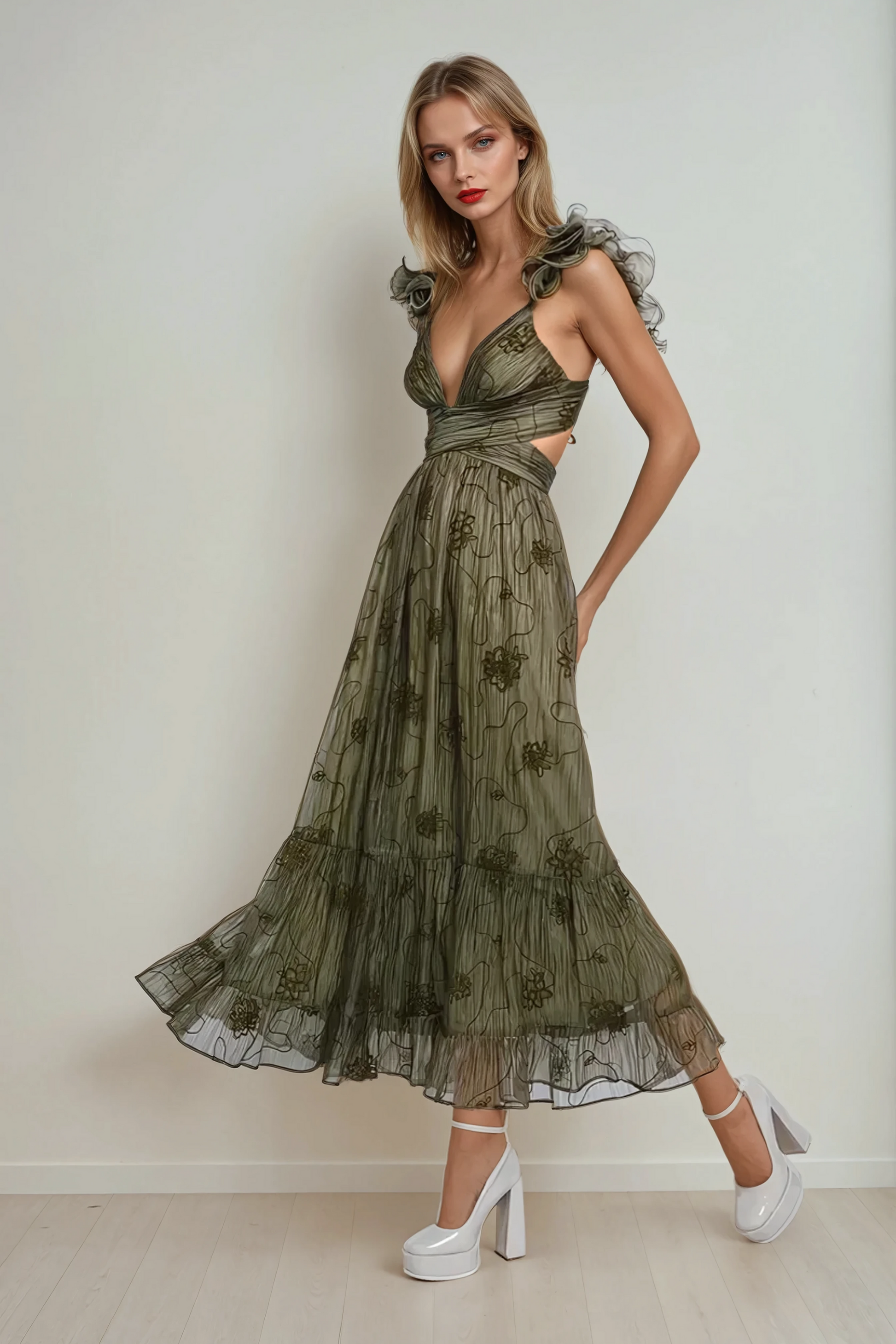 The Verona Maxi Dress embodies timeless romance and effortless elegance. Featuring delicate monochromatic floral embroidery, this dreamy gown is designed to make a statement. A plunging neckline and fluttering ruffled straps add a touch of femininity, while the empire waist enhances your silhouette. With cascading ruffles, side cut-outs, and a crisscross open-back tie, this dress is the perfect blend of sophistication and allure—ideal for weddings, garden soirées, or any enchanting occasion.